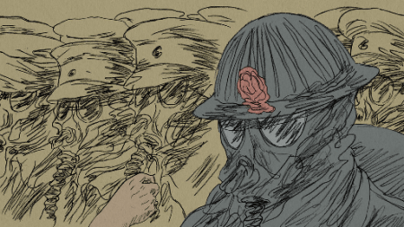 Oh, little soldier, jaunting happily towards the war, you pay no heed to the red petal you carry, marking the ones who’ll fall. Such petal is the sign of the mustard yellow death that will smother you in the pestiferous, muddy trenches. Not, however, without introducing you to some of the damned that have left already, and who are waiting for you in the fields of desolation.