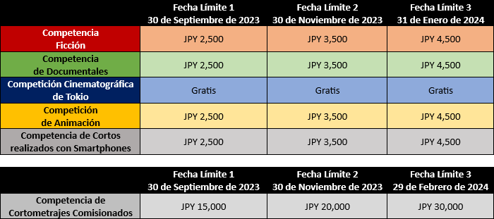 – Todas las presentaciones serán consideradas en tres categorías: Japón, Asia Internacional e Internacional. El comité del festival determinará la elegibilidad para cada categoría en función de los siguientes criterios: nacionalidad del director, lugar de rodaje, idioma de la película, nacionalidad del elenco y fuente de financiación.