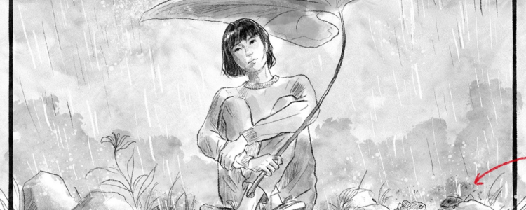 When Suli’s day starts with an eyeball in her beverage, it’s only the beginning of a series of rather absurd events. Various fantastic elements – ranging from an enormous cat to frogs that talk – all seem to be business as usual in Suli’s world. Enriched with casual commentary and a playful sense of humour, Anggun Priambodo presents an amusing and clever adventure in four acts. In the format of a storyboard, it leaves plenty of room for our imagination. – Koen de Rooij (IFFR 2024)